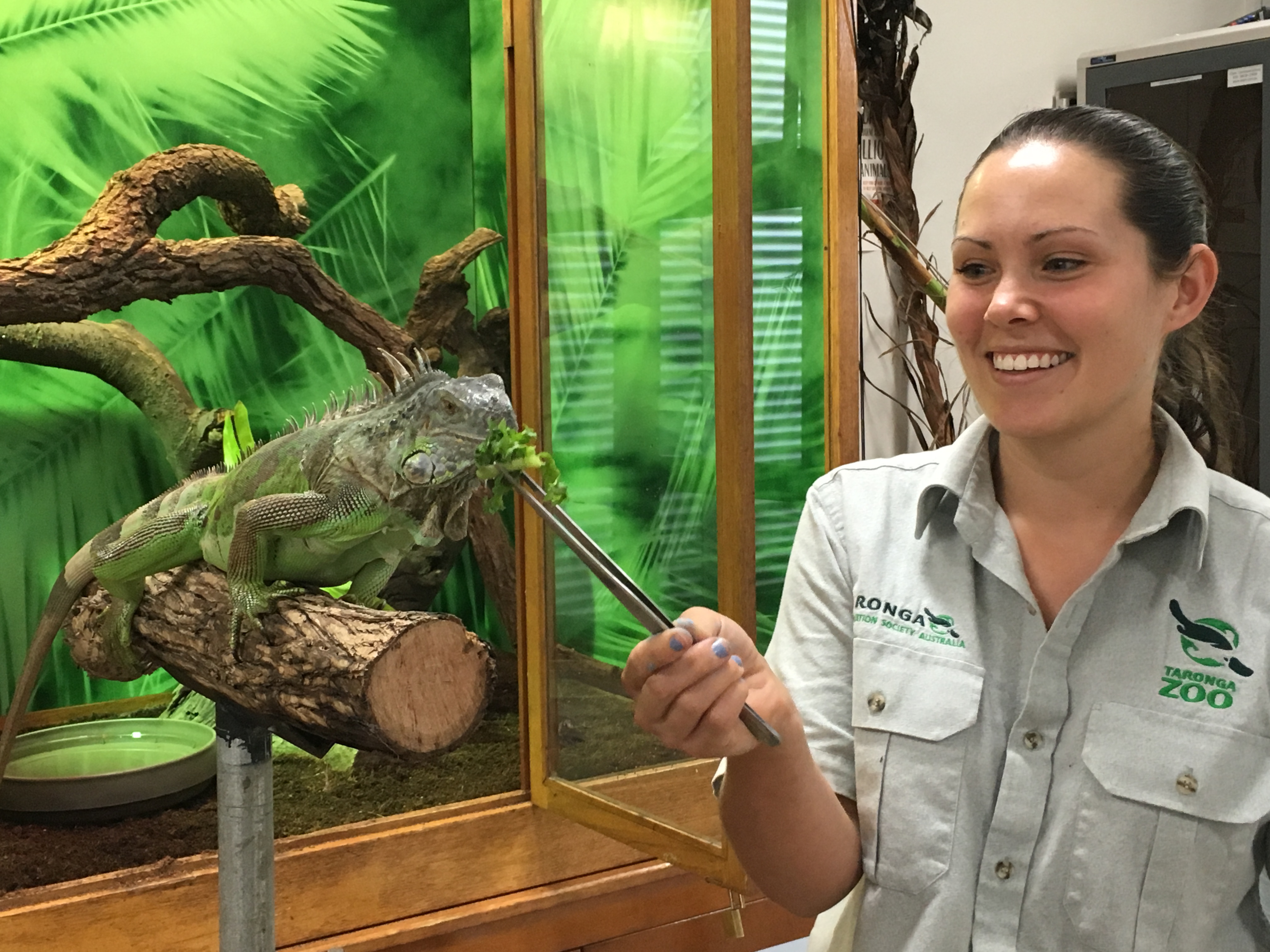 Our Green Iguana, Chile, lives at the Education Centre and gets very involved in her training sessions. Chile will be four years old in January and is very confident in climbing out on to her perch during presentations to guests. The perch is moved into the middle of the classroom so our guests and school students can see her up close and watch as she gobbles down her favourite greens like kale and sprouts! She’s a bit of a messy eater!