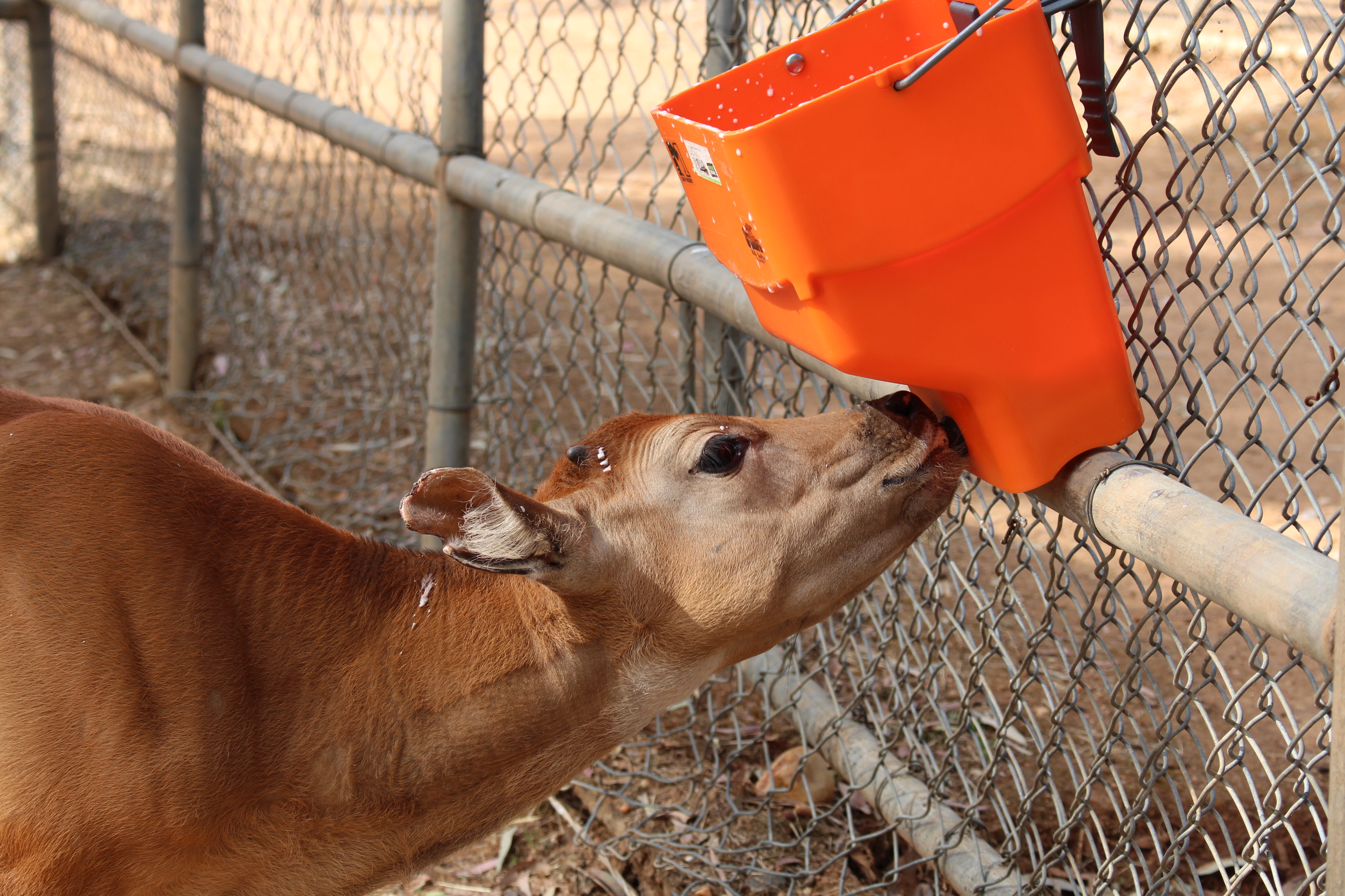 The calf feeder is positioned on a fence easily accessed by the calf; the feeder has a teat on the bottom so the calf can feed himself. When the calf learnt how to drink on its own he was successfully reintroduced to the Banteng herd.