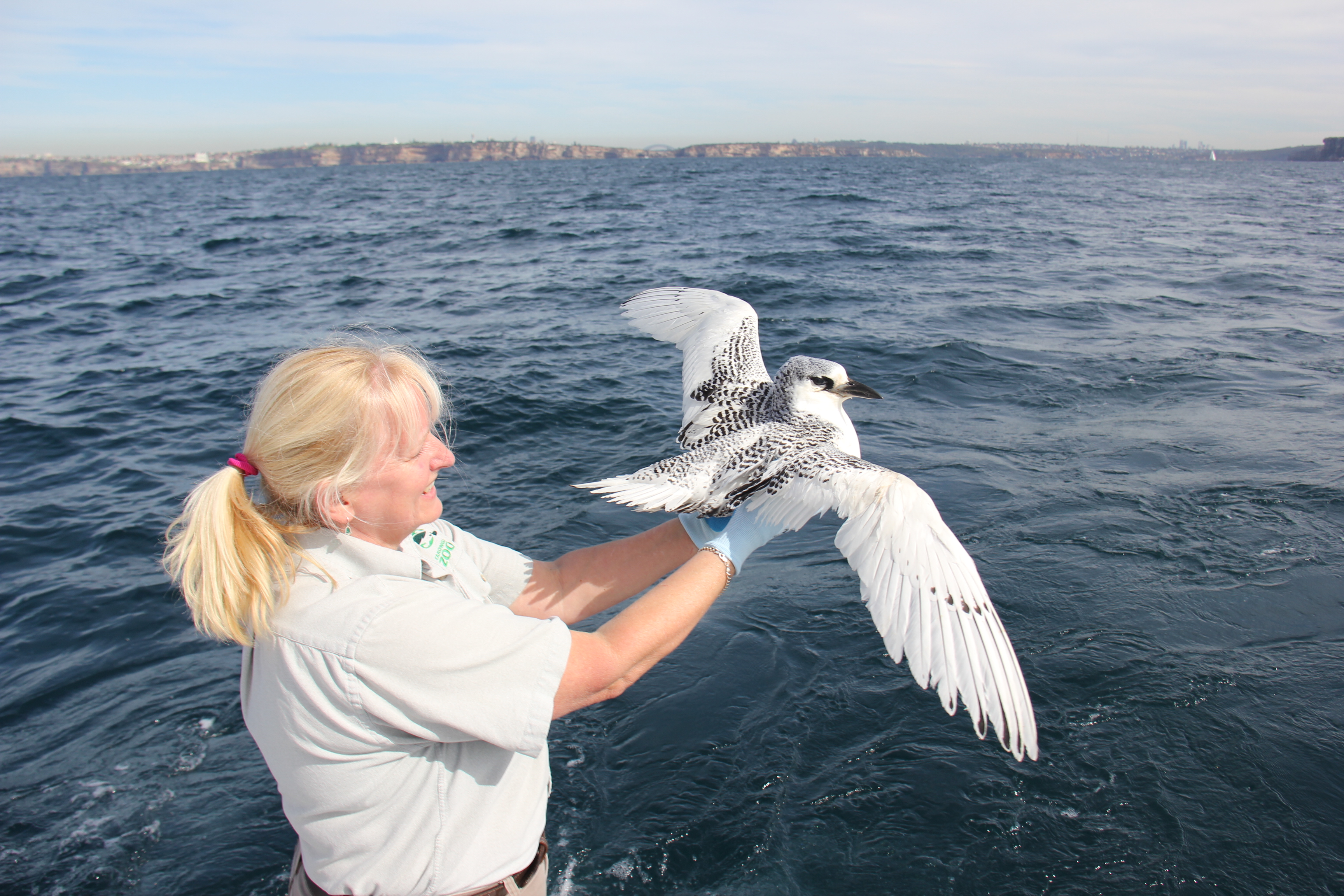 A juvenile Tropicbird was released off the Heads in Sydney Harbour last week, three weeks after it was first rescued in Dunedoo, near Dubbo, nearly 300 kilometres from the ocean.Taronga Wildlife Hospital Nurse Annabelle Schlemeier said she can only guess how the sea-bird got so far inland to Dunedoo. She suggested that perhaps it was blown in on strong winds or a cyclone.The Tropicbird was discovered on a property in Dunedoo, and then taken to Taronga Western Plain Zoo’s Wildlife Hospital for treatment for dehydration and exhaustion. Once the bird was strong enough after three weeks of care, it was taken to Taronga Zoo, Sydney where it was released back into the wild. The black beak and short tail feathers suggest that the Tropicbird was a juvenile, said Annabelle. As it reaches maturity, it will start to develop pure white plumage, a bright red beak and long, streaming tail feathers.Tropicbirds are sea-birds that only come to land to nest. They generally fly around the tropical waters of the Indian and Pacific Ocean including Australia, Indonesia, Papua New Guinea and South Africa.Their preference for the tropics means Tropicbirds are rarely seen in Sydney, and on exceptional occasions they have been seen as far south as Wollongong.