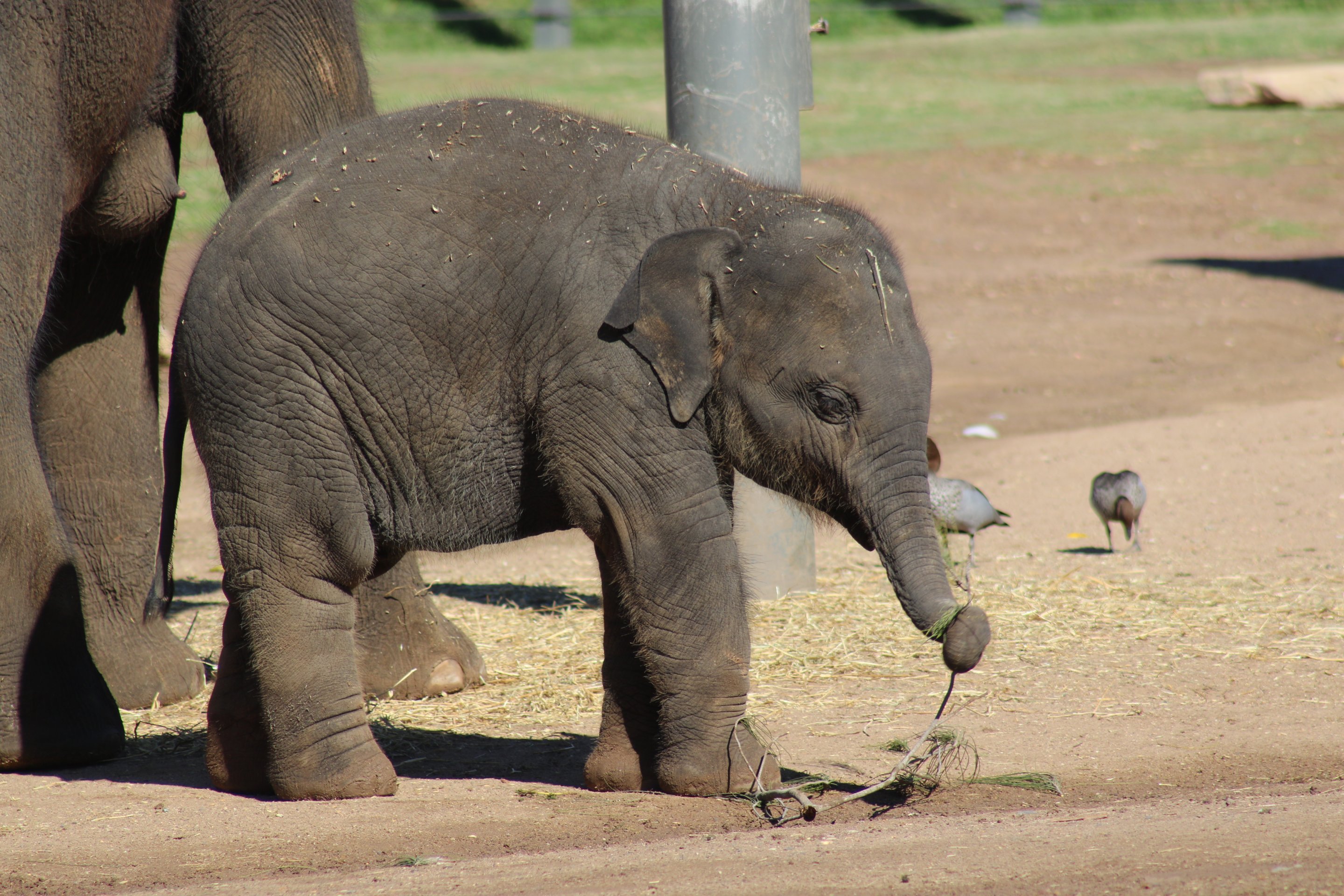 Asian Elephant calf Kanlaya is now 10 months of age and fast approaching her first birthday on 14 June 2019. As she has grown and developed over the past few months we have seen Kanlaya spend more time with two year old calf, Sabai. The two are confident together, playing on their own away from their mothers, Porntip and Thong Dee. They are often observed playing in the pool, dust bathing and sometimes having a nap on the dirt mounds. Sabai loves to lay on his side and let Kanlaya freely climb over him, which is great to see that they both have a playful nature towards each other. Porntip is quite the protective mother but has been more relaxed in letting Kanlaya adventure on her own.